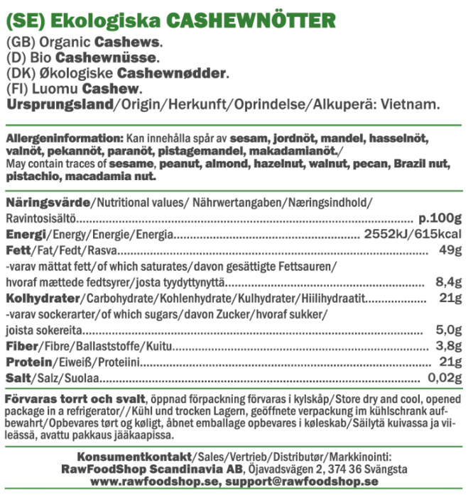EU Organic-sertifiseringen sikrer at produktet er dyrket i henhold til strenge økologiske retningslinjer, noe som betyr at det er fritt for syntetiske plantevernmidler og at det produseres med fokus på bærekraft. Dette gjør våre cashewnøtter til et utmerket valg for deg som verdsetter økologiske produkter av høy kvalitet.