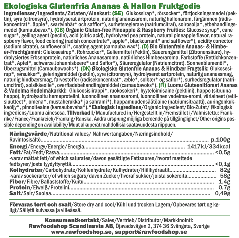 Bak Ananas & Bringebær Fruktgodteri ØKO ligger en ekte omtanke for både kvalitet og miljø. Med økologiske råvarer og bærekraftige produksjonsmetoder, er dette et godt eksempel på hvordan man kan kose seg med god samvittighet. Enten du vil unne deg noe søtt til helgekosen eller fylle påskeegget med noe utenom det vanlige, er dette fruktgodteriet et smakfullt valg som passer til alle anledninger. Vegansk, økologisk og fullt av personlighet – dette deilige fruktgodteriet smaker akkurat like godt som det ser ut.