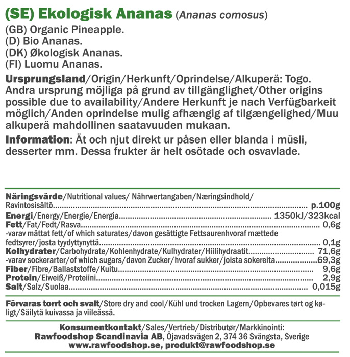 I tillegg til å være en allsidig ingrediens på kjøkkenet, er tørket ananas en perfekt snack. Den er lett å ta med på reisen eller å nyte rett fra posen når du er på farten. Siden den er usøtet får du den rene, konsentrerte smaken av ananas uten tilsetninger, noe som gjør den til et deilig alternativ for alle som elsker naturlige smaker. Hvorfor ikke prøve å male bitene til et fint ananaspulver? Bruk pulveret for å smaksette smoothies, bakverk eller til og med som en eksotisk topping på frokostskålene dine. Vil du gjøre det litt enklere? Ta en titt på vårt Ananaspulver EKO og inviter smaken av ananas til hverdagens alle anledninger!
