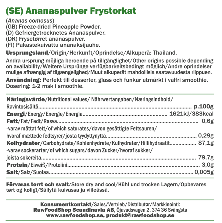 Ananaspulver er en allsidig ingrediens som raskt har blitt en favoritt i både veganske oppskrifter og rawfood-kjøkkenet. Med sin naturlige aroma og intense fruktighet er det en enkel måte å løfte både hverdagsretter og festlige desserter på. Dryss litt pulver over frisk frukt, bland det i chiapudding eller tilsett i smoothien for en frisk og eksotisk smak. Sammen med tropiske smaker som mango eller papaya blir ananaspulver en perfekt base for kreative fruktblandinger og forfriskende drikker. For deg som liker å eksperimentere på kjøkkenet, åpner dette fruktpulveret opp for nye og spennende smaksopplevelser – både søte og syrlige.
