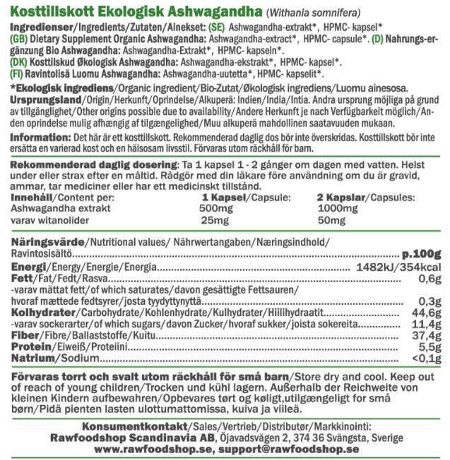 Ashwagandha Extract ØKO 500mg er valget for deg som søker et økologisk og plantebasert kosttilskudd. Med et innhold på 500 mg økologisk ashwagandha-ekstrakt per kapsel, også kjent som indisk ginseng, tilbyr dette produktet rene ingredienser fremstilt med omtanke. Kapslene er veganske og produsert uten GMO, gluten eller tilsatt sukker. I tillegg er de fri for kunstige fargestoffer, noe som gjør dem til et kosttilskudd som passer alle livsstiler.