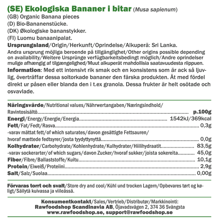 Våre soltørkede bananer i biter, pakket i en praktisk 200g pose, er en sann smaksopplevelse. Disse tørkede bananene er ikke bare økologiske og veganske, men de er også skånsomt soltørket for å bevare den intense, rike smaken og myke konsistensen. Perfekte å nyte direkte fra posen eller å blande i din favorittgranola når du vil nyte litt ekstra.