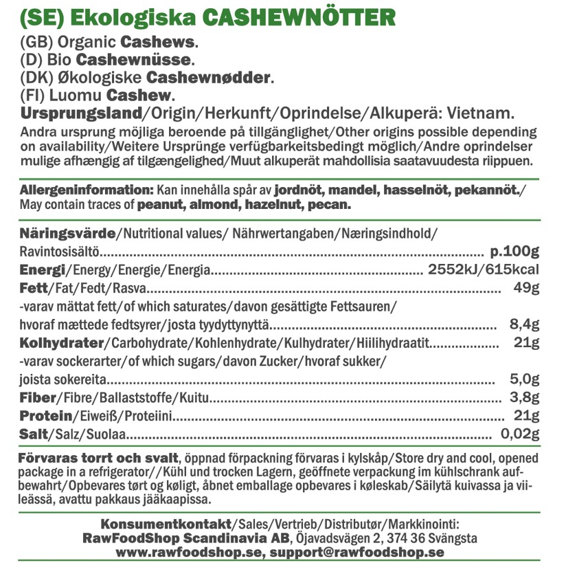EU Organic-sertifiseringen sikrer at produktet er dyrket i henhold til strenge økologiske retningslinjer, noe som betyr at det er fritt for syntetiske plantevernmidler og at det produseres med fokus på bærekraft. Dette gjør våre cashewnøtter til et utmerket valg for deg som verdsetter økologiske produkter av høy kvalitet.