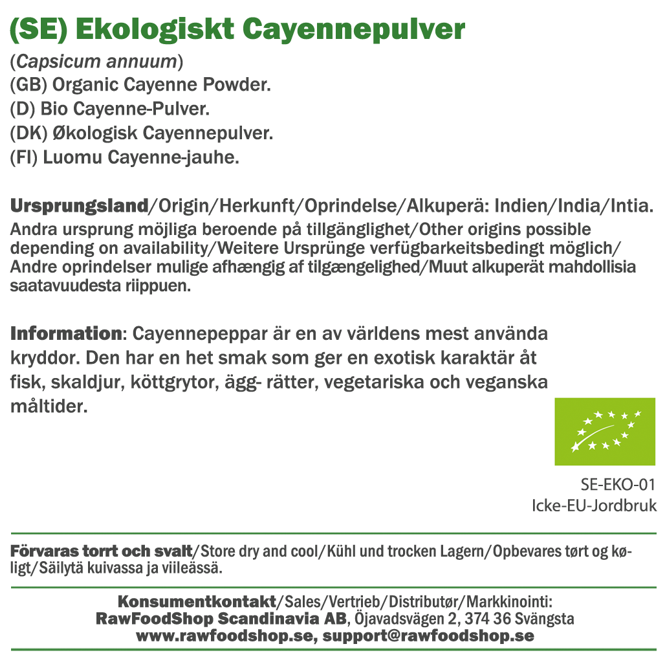 Cayennepepper er en klassiker i krydderhyllen, og vårt økologiske cayennepulver er intet unntak. Denne varianten har en intens styrke og en dyp, aromatisk smak som setter preg på alt fra gryter og supper til sauser og marinader. Den finmalte konsistensen gjør det enkelt å dosere og gir et smaksrikt løft uten å bli for sterkt. Ved å velge en økologisk variant får du en ren krydderopplevelse, dyrket med omtanke for både natur og kvalitet. Krydderet lages av tørket chili som males til et fint pulver – enkelt, rent og smakfullt.