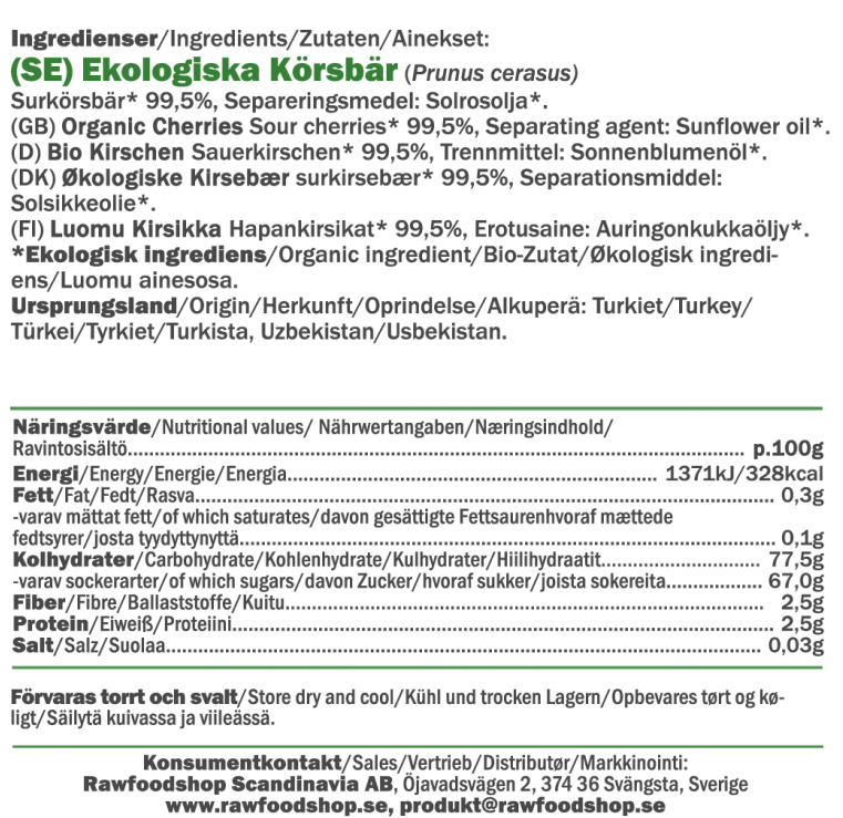 Våre tørkede kirsebær er nøye utvalgte surkirsebær, økologisk dyrket og skånsomt råtørket for å bevare deres syrlige smak og naturlige karakter. Med sin balanserte syre og sødme er de et utmerket innslag til både søte og salte retter. Pakket i en generøs 500g pose, er disse råtørkede kirsebærene et deilig, vegansk alternativ for deg som vil leve en mer bærekraftig livsstil.