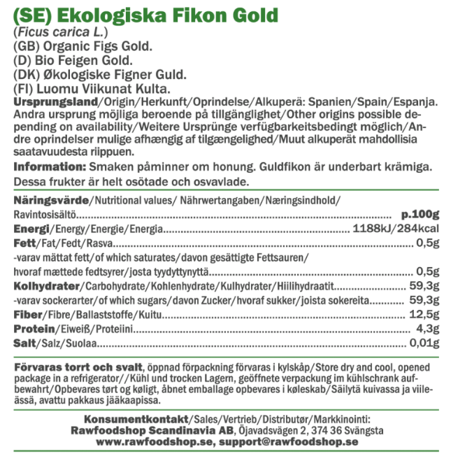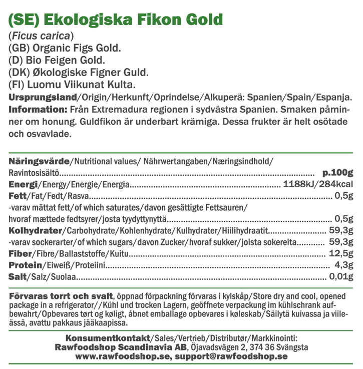 Når du velger våre tørkede gullfiken får du ikke bare en smaksrik opplevelse, men også et produkt som lever opp til høye krav på kvalitet og bærekraft. Disse fikenene er økologiske i henhold til EUs standard, noe som betyr at de er dyrket uten syntetiske plantevernmidler eller kunstgjødsel. De er også veganske og råtørkede, eller rawfood, noe som sikrer at de beholder sin naturlige karakter. Med tørkede gullfiken kan du være sikker på at du får en god råvare fra naturens spiskammer som passer perfekt i en bærekraftig hverdag.