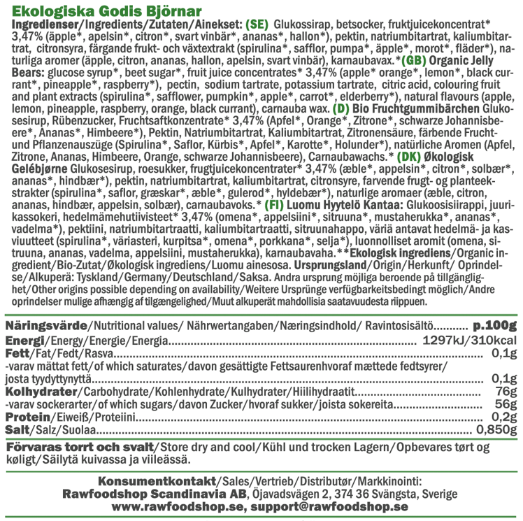 Hvem sier at lørdagsgodt bare er for barn? Våre økologiske godis-bjørner er like mye et fargerikt innslag på fredagskosen som et friskt og deilig snacks på farten. Med smaker av eple, appelsin, sitron, solbær, bringebær og ananas får du en liten smaksopplevelse i hver bit. Dette er vegansk godteri uten gelatin – perfekt for deg som vil nyte klassiske gelébiter på en måte som passer både veganere og vegetarianere. Den seige, geléaktige konsistensen kombinert med intens fruktighet gjør godis-bjørnene til en sikker favoritt for både store og små.