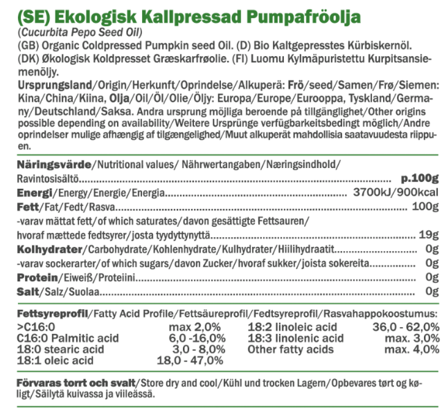 Vår økologiske, kaldpressede gresskarfrøolje er en naturlig vegetabilsk olje med dyp grønn farge og en rik, nøtteaktig smak. Fordi den er kaldpresset, bevares den karakteristiske smaken fra gresskarfrøene på best mulig måte. Gresskarfrøolje er varmesensitiv og bør derfor brukes i kalde retter – perfekt i salater, dressinger og marinader, eller som en smakfull topping på supper. Den tilfører også en spennende smak i bakverk. Et enkelt og naturlig løft for hverdagsmaten. For best mulig holdbarhet anbefales det å oppbevare oljen kjølig – enten i kjøleskap eller i et mørkt og svalt skap. Den mørke flasken beskytter mot lys og bidrar til å bevare smak og kvalitet lenger.