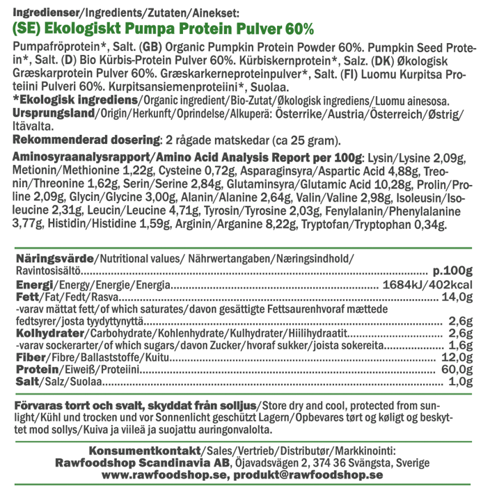 Vårt Gresskarprotein 60% ØKO er et plantebasert proteinpulver laget av skånsomt bearbeidede gresskarkjerner. Det er et utmerket alternativ for deg som ønsker et naturlig og økologisk vegansk proteinpulver uten tilsetningsstoffer. Med sin nøtteaktige, milde smak passer det perfekt i mange ulike retter og bakverk. Bland det i morgensmoothien din, tilsett det i hjemmelaget brød eller bruk det i dine favorittoppskrifter for å gi dem et ekstra tilskudd av protein fra gresskarfrø. Siden pulveret er rått og økologisk, bevares alle dets naturlige egenskaper, noe som gjør det til et fantastisk supplement i en balansert hverdag.