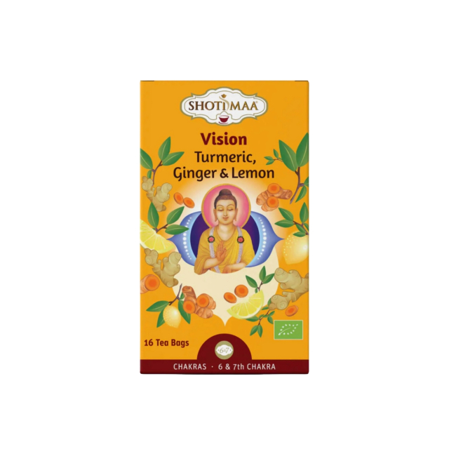 La deg inspirere av Gurkemeie, Ingefær & Sitron Urtete ØKO – en økologisk urteblanding der gurkemeie, ingefær og sitron smelter sammen i perfekt harmoni. Denne smakfulle teen, også kjent som "Shoti Maa Vision", er laget med omtanke etter ayurvediske tradisjoner og byr på en helt spesiell smaksopplevelse. Med Shoti Maa – et familieeid selskap som siden 2008 har laget økologiske teblandinger – får du et urte-te som kombinerer kvalitet, kunnskap og lidenskap.