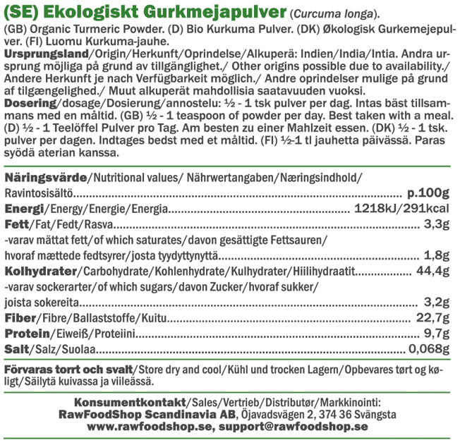 Økologisk gurkemeie (Curcuma longa L.) er et velkjent krydder som gir karri og sennep deres karakteristiske gule farge. Den kommer fra roten til ingefærplanten og dyrkes i flere deler av verden, inkludert Asia, Afrika og Amerika. Gurkemeiepulveret har en lett jordaktig og bitter smak som ofte mildnes når det tilberedes i olje eller blandes med plantebasert melk.