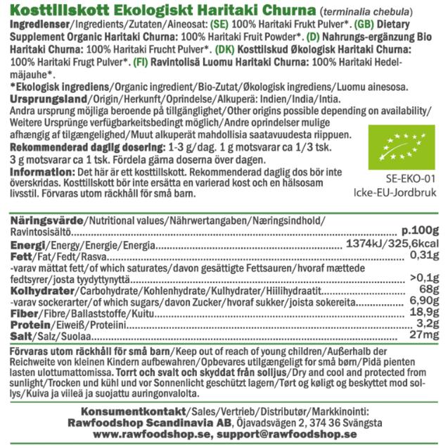Haritaki Churna er et økologisk, vegansk kosttilskudd laget av Haritaki (Terminalia chebula). Haritaki brukes innen ayurveda. Dette kosttilskuddet består av finmalt pulver fra den lille nøttelignende frukten fra Haritaki-treet, som først tørkes skånsomt før den males til et lett anvendelig pulver. Produktet er økologisk og produsert med omtanke for både råvare og miljø.