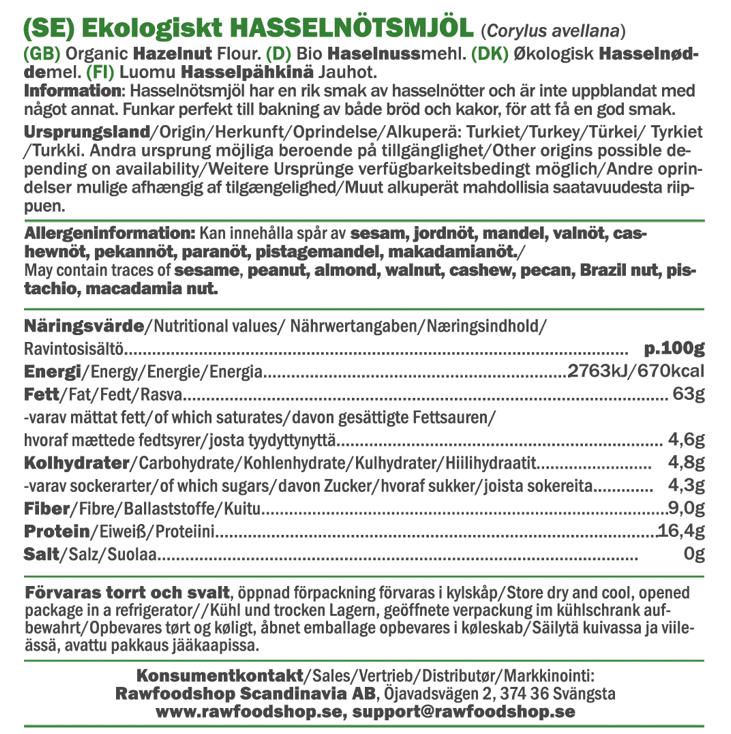 Vårt ristede hasselnøttmel er sertifisert i henhold til EU Organic-standard, noe som betyr at det er produsert uten syntetiske plantevernmidler og med respekt for naturen. Når du velger vårt hasselnøttmel, får du ikke bare et produkt av høyeste kvalitet, men også et miljøvennlig alternativ du kan stole på. Med sitt opphav i økologisk dyrkede hasselnøtter er dette melet et bærekraftig og deilig valg for alle dine glutenfrie og veganske bakverk.