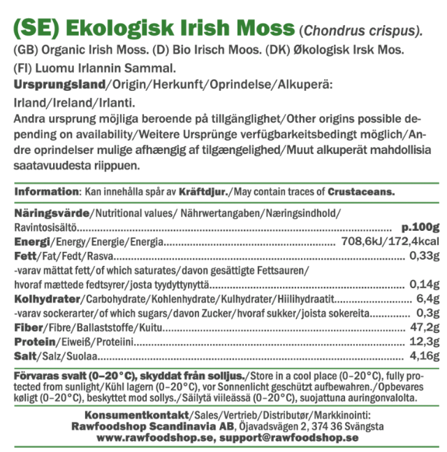 Irish Moss, også kalt Chondrus crispus eller irsk mose, er en rødalge som vokser langs Atlanterhavskysten og har vært brukt i generasjoner for sine unike egenskaper. Vår økologiske Irish Moss kommer direkte fra Irland og kan brukes både som den er eller for å skape en geléaktig konsistens i matlaging og baking. Når den kokes, danner den en naturlig gele takket være sitt innhold av karagen (E407), noe som gjør den til et perfekt alternativ til gelatin. Dens milde smak kan enkelt skylles bort, noe som gjør den utmerket i både rawfood-oppskrifter og veganske desserter.