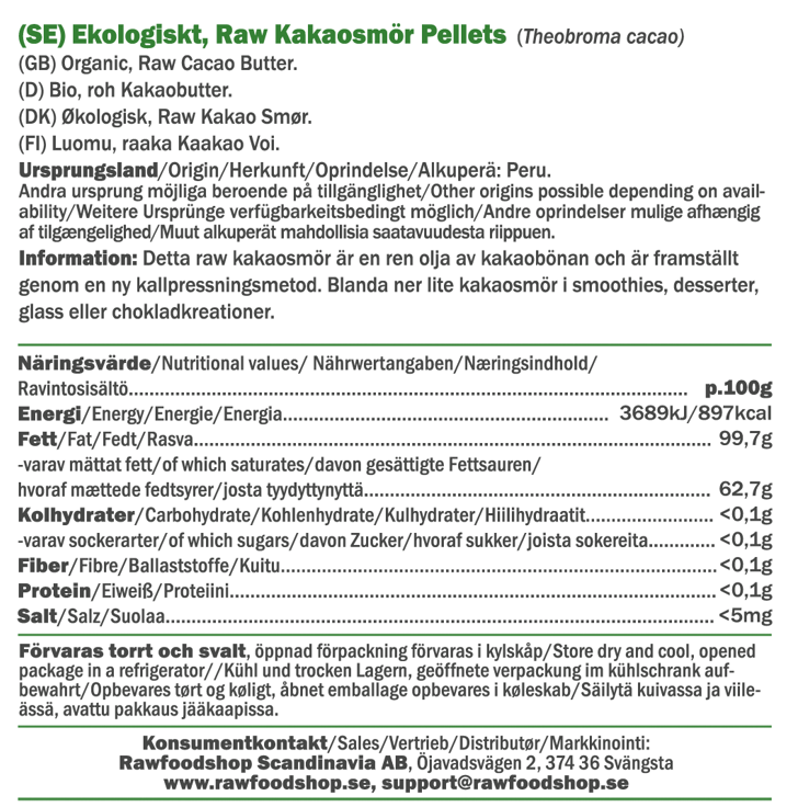 Kakaosmør er kjent for sin silkemyke konsistens og lett absorberende egenskaper, noe som gjør det til et utmerket valg for hudpleie. Bruk det som en naturlig hudkrem eller en mykgjørende massasjeolje ved å blande det med for eksempel kokosolje. De praktiske pelletsene smelter ved omtrent 35°C, noe som gjør dem enkle å påføre direkte på huden. Perfekt for å lage egne hudpleieprodukter eller for en luksuriøs og pleiende massasje.