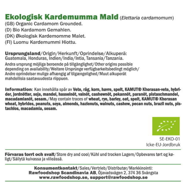 Økologisk malt kardemomme er et krydder med en varm og aromatisk smak som brukes over hele verden i matlaging og baking. Den finmalte konsistensen gjør det enkelt å bruke i alt fra bakverk til drikker. Opprinnelig fra Sørøst-Asia er kardemomme et av verdens mest verdsatte krydder og en uunnværlig del av mange tradisjonelle oppskrifter.