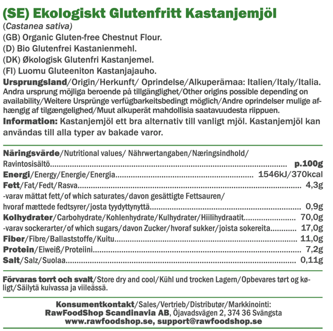 Vårt kastanjemel er sertifisert i henhold til EU Organic-standard, hvilket betyr at det fremstilles uten syntetiske plantevernmidler og under bærekraftige forhold. Dette gjør at du kan være sikker på at du får et produkt som er både bra for deg og for miljøet. Med sitt opphav i økologisk dyrkede kastanjer er vårt kastanjemel et bærekraftig og velsmakende alternativ for alle dine glutenfrie og veganske bakverk.