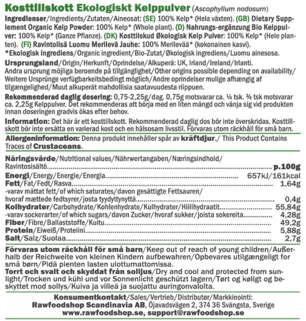 Kelp er en brunalge som har vært brukt i matlaging i mange kulturer verden over – spesielt i det asiatiske kjøkkenet. Med dette økologiske kelp-pulveret får du en praktisk og allsidig ingrediens som passer perfekt i hverdagsmaten. Pulveret har en naturlig salt og aromatisk smak med tydelig preg av havet, og er ideelt som smaksforsterker i alt fra salater og supper til varme gryter og marinader. Dryss litt over maten før servering, eller bland det direkte inn i matlagingen for å gi rettene en ekstra smaksmessig dimensjon. Kelp er en type havplante som vokser i kalde, mineralrike havområder – og har blitt en populær ingrediens innen plantebasert mat.