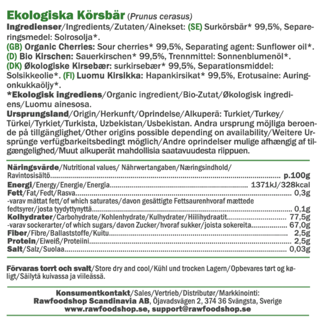 Våre tørkede kirsebær er nøye utvalgte surkirsebær, økologisk dyrket og skånsomt råtørket for å bevare deres syrlige smak og naturlige karakter. Med sin balanserte syre og sødme er de et utmerket innslag til både søte og salte retter. Pakket i en generøs 1kg pose, er disse råtørkede kirsebærene et deilig, vegansk alternativ for deg som vil leve en mer bærekraftig livsstil.