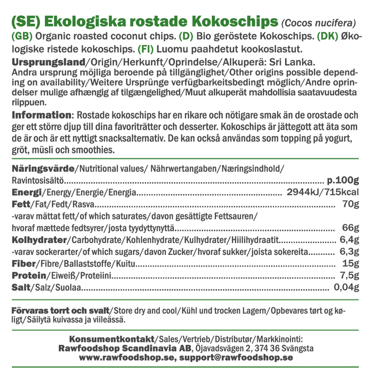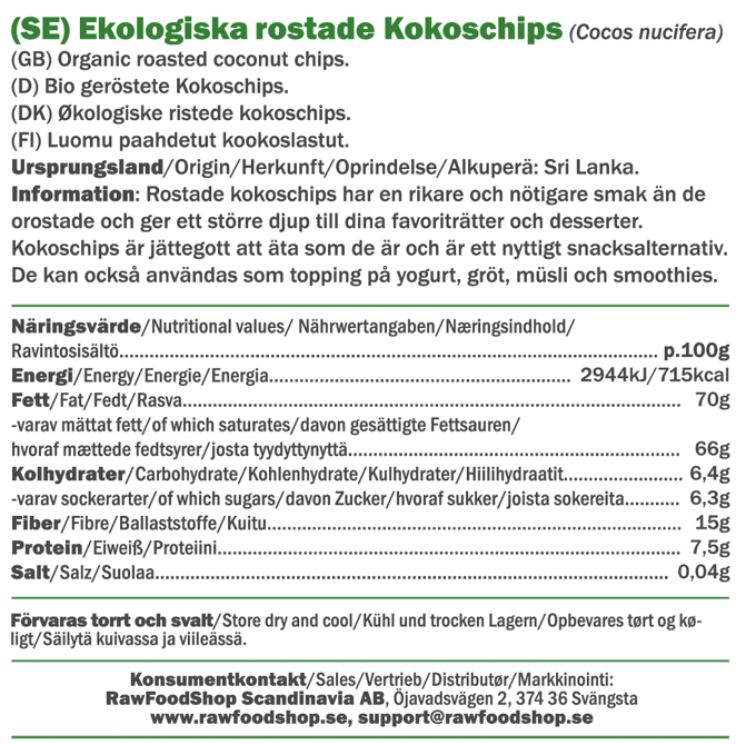 Våre kokoschips er sertifisert i henhold til EU Organic-standard, som garanterer at de produseres uten syntetiske bekjempningsmidler og under bærekraftige forhold. Når du velger våre kokoschips får du ikke bare et produkt som smaker fantastisk, men også et miljøvennlig alternativ som er bra for både deg og planeten. Uansett om du lager vegansk mat, baker glutenfritt eller bare vil legge til litt ekstra sprøhet i dine retter, er våre ristede kokoschips det perfekte valget.