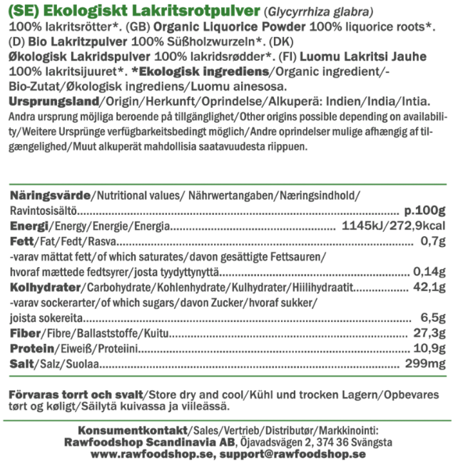 Når du velger vårt Lakrisrotpulver ØKO, får du ikke bare et produkt av høyeste kvalitet, men også tryggheten i at det er helt økologisk. Dette betyr at lakrisroten er dyrket uten kunstige sprøytemidler eller tilsetningsstoffer, noe som gjør det til et bevisst valg for deg som prioriterer rene råvarer. Emballasjen på 125 g er perfekt for både ivrige hjemmebakere og matelskere som ønsker å eksperimentere med nye oppskrifter. Gi rettene dine en ekstra dose karakter – la lakrisrotpulveret bli din nye favoritt på kjøkkenet!