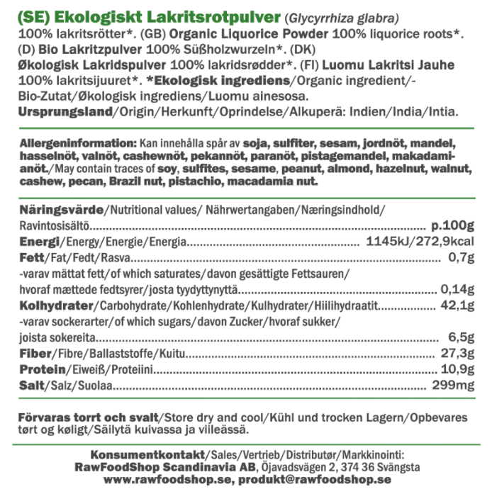 Når du velger vårt Lakrisrotpulver ØKO, får du ikke bare et produkt av høyeste kvalitet, men også tryggheten i at det er helt økologisk. Dette betyr at lakrisroten er dyrket uten kunstige sprøytemidler eller tilsetningsstoffer, noe som gjør det til et bevisst valg for deg som prioriterer rene råvarer. Emballasjen på 250 g er perfekt for både ivrige hjemmebakere og matelskere som ønsker å eksperimentere med nye oppskrifter. Gi rettene dine en ekstra dose karakter – la lakrisrotpulveret bli din nye favoritt på kjøkkenet!