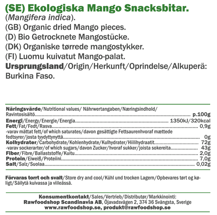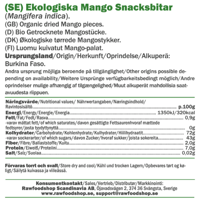 Tørket mango har aldri smakt bedre. Mango Snackbiter ØKO byr på økologiske mangobiter med rik fruktsmak og en seig, deilig konsistens – perfekt som et raskt og velsmakende mellommåltid. Denne tørkede frukten er 100% vegansk og passer for deg som ønsker et naturlig alternativ uten unødvendige tilsetningsstoffer. Tørket mango er et populært valg for deg som vil ha naturlig sødme i hverdagen. Like perfekt i vesken, treningsbagen eller som snacks til barna.