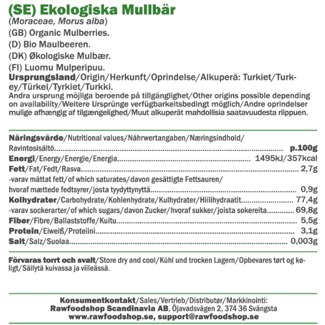 Våre tørkede morbær har en myk, karamellaktig konsistens og en smak som minner om myk vaniljekaramell. Bærene kommer fra morbærtrær som vokser i naturlige miljøer hvor de får tørke sakte i solen. Disse tørkede morbærene er naturlige og økologiske – helt fri for tilsatt sukker og svovel. Perfekte å nyte direkte fra posen eller som en del av dine favorittoppskrifter!