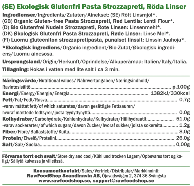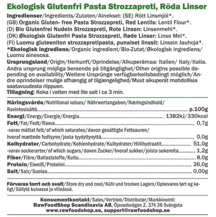 Strozzapreti-pasta laget av røde linser er det perfekte valget for deg som vil ha et naturlig, næringsrikt og smakfullt alternativ til tradisjonell pasta. Denne linsepastaen består kun av én ingrediens – 100 % økologiske røde linser. Ikke noe mer, ikke noe mindre. Det gjør den helt fri for gluten, og helt plantebasert. Med andre ord: et supert valg både for veganere og for hele familien til hverdags. Pastaen har en fyldig, god konsistens som holder seg fast og saftig etter koking. Den passer like godt i varme gryter som i kalde salater – og alt imellom.
