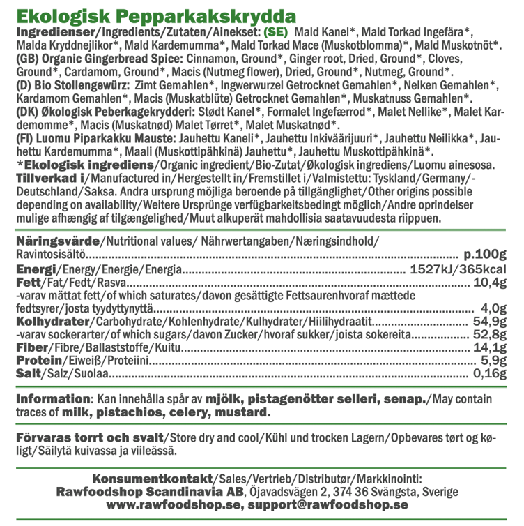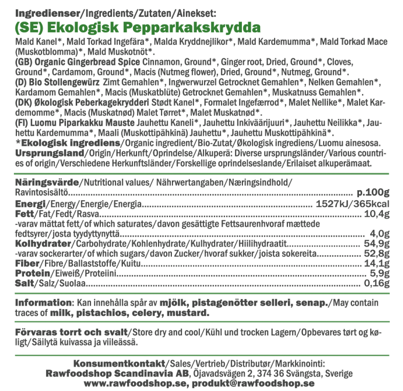 Her får du en økologisk krydderblanding som gir baksten din den klassiske smaken av pepperkaker. Den perfekt balanserte miksen av kanel, nellik, kardemomme, muskatblomme og muskatnøtt gir en fyldig og krydret smak som løfter alt fra myke pepperkakekaker til tradisjonelle småkaker. Dette er krydderet for deg som elsker både tradisjonelle juleoppskrifter og moderne varianter – enten du baker glutenfritt, vegansk eller bare vil ha naturlige råvarer med masse smak. Bruk den i smoothie, granola, yoghurt, varm melk eller chai latte for å få den deilige pepperkakefølelsen – raskt og enkelt.