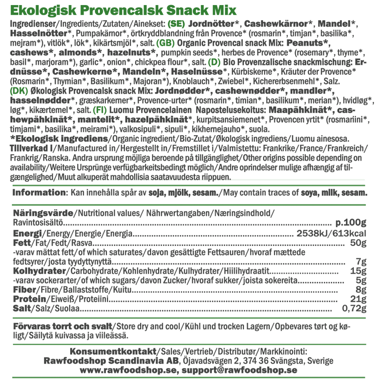 Provencal Snackmiks ØKO er en økologisk blanding av nøtter og frø, smaksatt med de klassiske "herbes de Provence" – en aromatisk urteblanding som sender tankene rett til solfylte landskap i Sør-Frankrike. Her får du et vegansk snacks med det lille ekstra: en velbalansert miks av peanøtter, cashewnøtter, mandler, hasselnøtter og gresskarkjerner som gir både smak og crunch i hver eneste munnfull. Denne smakfulle nøttemiksen passer perfekt som tilbehør til et glass vin eller som topping på en frisk salat – og gjør seg minst like godt som et raskt mellommåltid på tur.