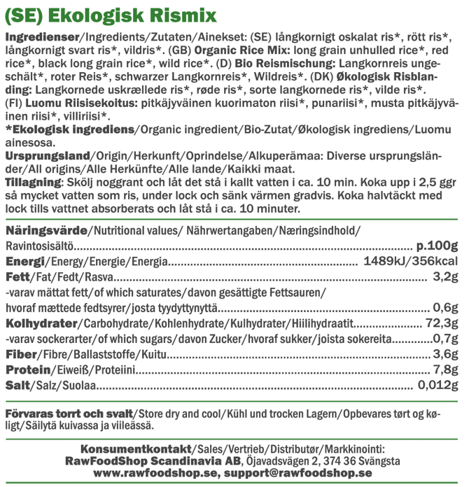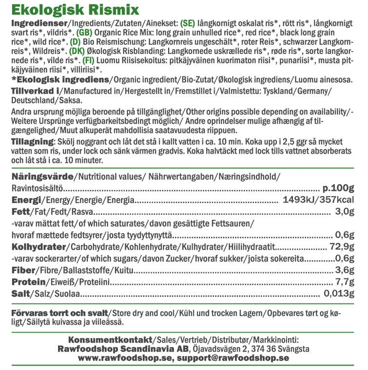 Ris Mix ØKO er en økologisk blanding av fire smakfulle ristyper: fullkornet langkornris, rødt ris, svart ris og villris. Perfekt for deg som ønsker ris med både karakter og tekstur. Den flotte kombinasjonen av farger og konsistenser gjør det enkelt å lage retter som både ser lekre ut og smaker nydelig. Svart ris gir dyp farge og fylde, mens villrisen tilfører en mild, nøtteaktig smak. Enten du lager gryterett, risotto eller salat – denne blandingen løfter måltidet. Lurer du på hvordan du best koker ris? Bare følg tilberedningsinstruksjonene, så får du perfekt ris med deilig tyggemotstand – hver gang.