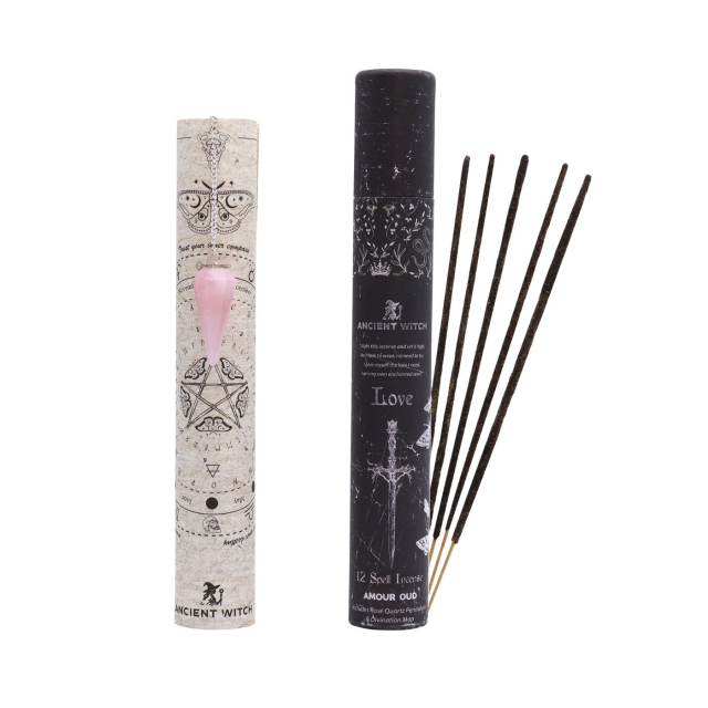 The Love Spell Incense er et følelsesladet ritualsett som inviterer kjærlighet, selvhelbredelse og åpning av hjertet. Pakken inneholder tolv røkelsespinner med myk, blomsteraktig duft, en pendel av rosenkvarts og et spådomskart – alt presentert i et elegant rør med symbolsk design inspirert av moderne magi.