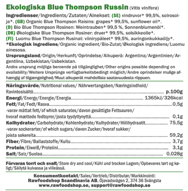 Økologiske Blue Thompson-rosiner er mørke, søte rosiner som kommer fra nøye utvalgte og modne druer. Disse økologiske rosinene er helt naturlige, uten tilsatt sukker eller kunstige tilsetningsstoffer. Med sin rike smak og fyldige tekstur er de perfekte å nyte som de er – direkte fra posen – eller som et herlig innslag i din favorittgranola. Enten du vil ha noe godt å spise på farten eller trenger en ekstra touch til din hjemmelagde bakst, er disse rosinene et utmerket valg.