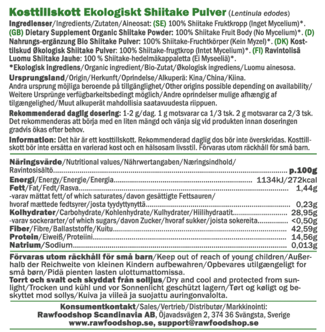 Det finmalte shiitake-pulveret kan enkelt tilsettes i varme drikker, supper eller smoothies. Siden det er et vegansk kosttilskudd, passer det perfekt for deg som foretrekker naturlige og plantebaserte alternativer. Med sin fyldige smak og økologiske opprinnelse er dette pulveret en praktisk ingrediens for deg som vil utforske tørket shiitake i en konsentrert form.