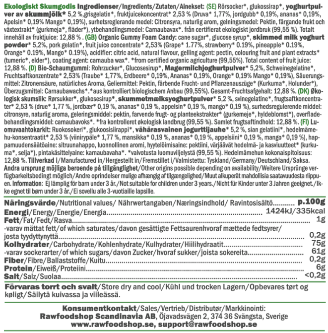 Enten det er fredagskos, en piknik eller en barnebursdag, er dette økologiske skumgodteriet et ypperlig valg. Den praktiske 100-gramsposen er lett å ha med og perfekt å dele med familie og venner – eller for å nyte alene som en liten hverdagsluksus. Med yoghurt-gummies som smelter i munnen og en subtil fruktsmak, er hver bit en liten påminnelse om hvor godt og naturlig godteri kan være. Velg vårt økologiske skumgodteri for en smakfull og omsorgsfullt laget godbit som gjør enhver anledning litt morsommere og litt bedre!
