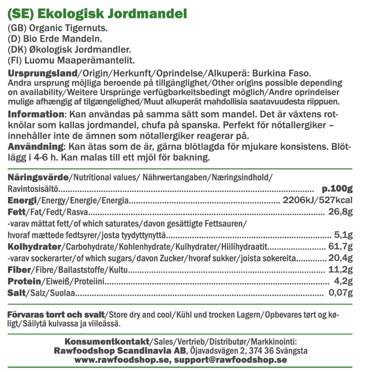 Jordmandelen har en lang og rik historie som strekker seg tilbake til det antikke Egypt. I dag er den en populær råvare i kjøkken verden over, takket være sin gode smak og allsidighet. Våre økologiske jordmandler er sertifisert i henhold til EU Organic-standard, noe som betyr at de er dyrket uten syntetiske plantevernmidler og under bærekraftige forhold.