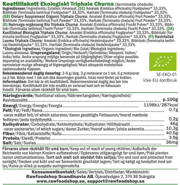 Triphala Churna ØKO er et økologisk og vegansk kosttilskudd laget av en tradisjonell blanding av fruktene Amalaki (Emblica officinalis), Bibhitaki (Terminalia bellirica) og Haritaki (Terminalia chebula). Triphala er en velkjent urteblanding innen ayurveda, og dette pulveret er fremstilt helt uten tilsetningsstoffer – kun rene, plantebaserte ingredienser.